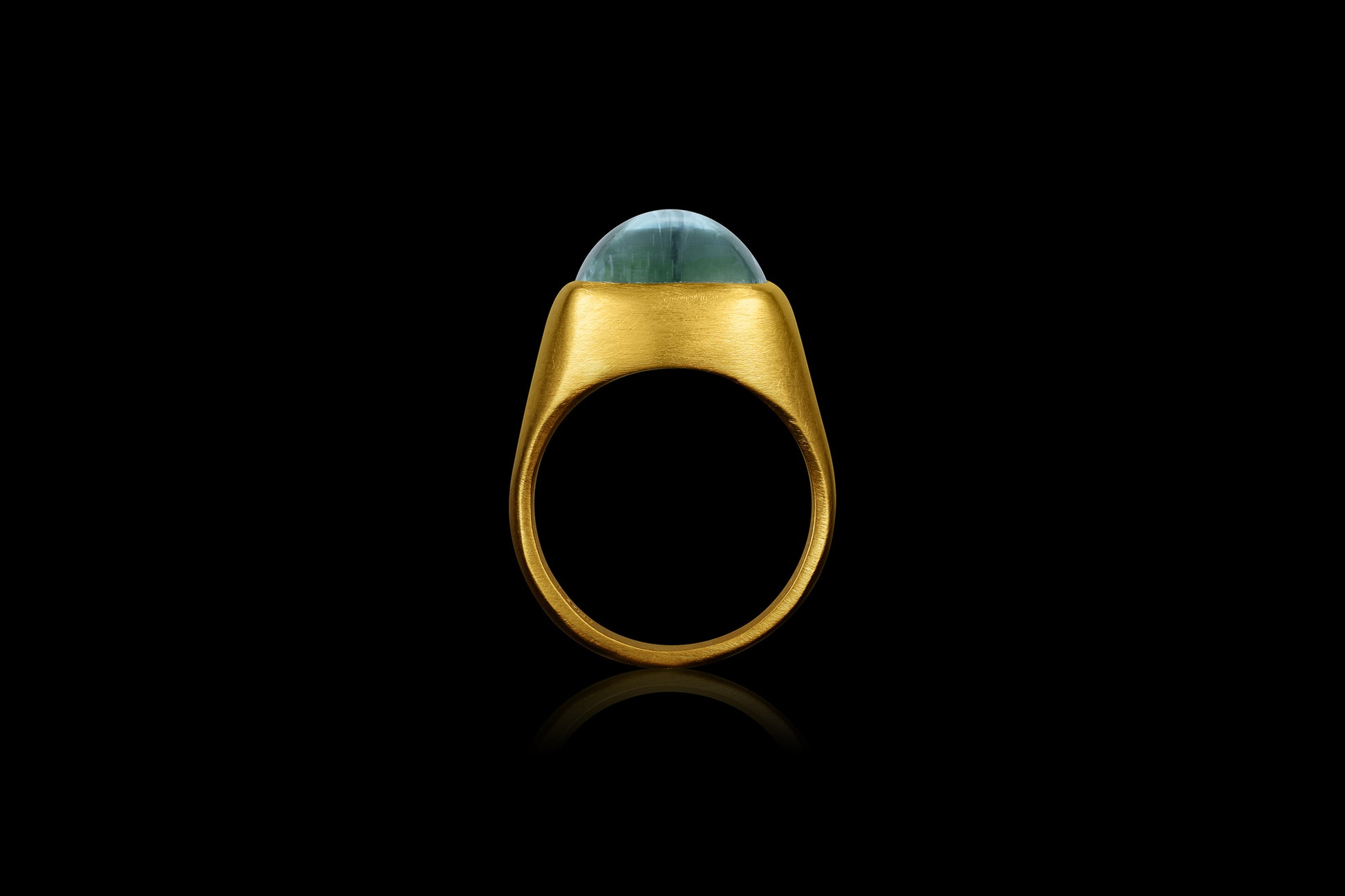 The tall, tapered profile of this hand-raised ring is perfectly shaped to fit the aquamarine at the center. Named for the important Italian family who produced four popes, two queens of France, and patronized artists including Leonardo da Vinci and Michelangelo, the Medici ring is inspired by the impressive presence of papal signet rings during the Renaissance. A smooth inner band closes the hollow form of the ring and fits comfortably against the finger. The gold is polished to a matte velvet finish.