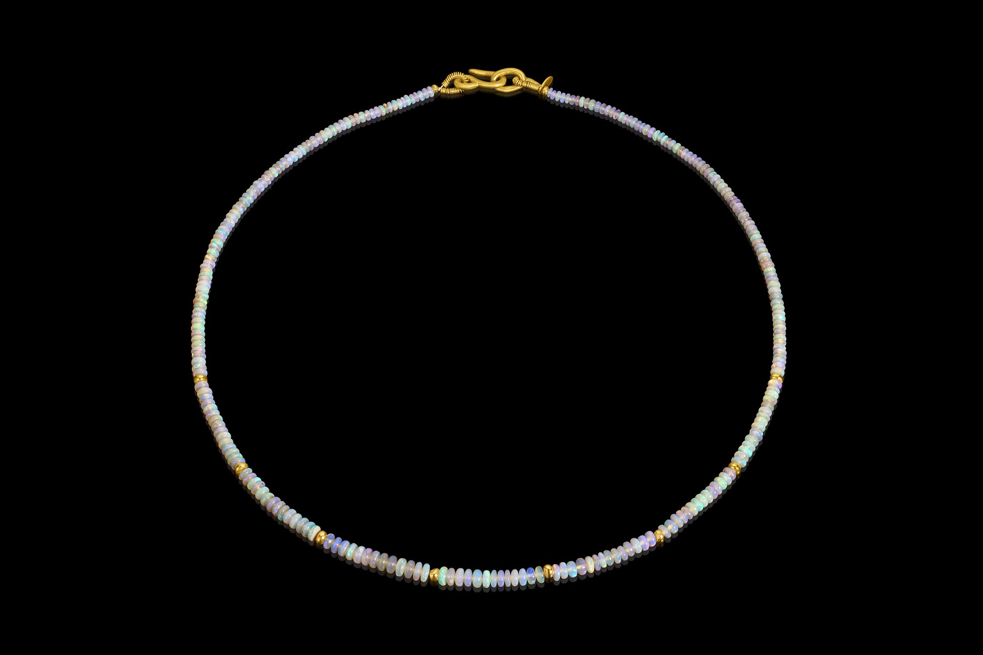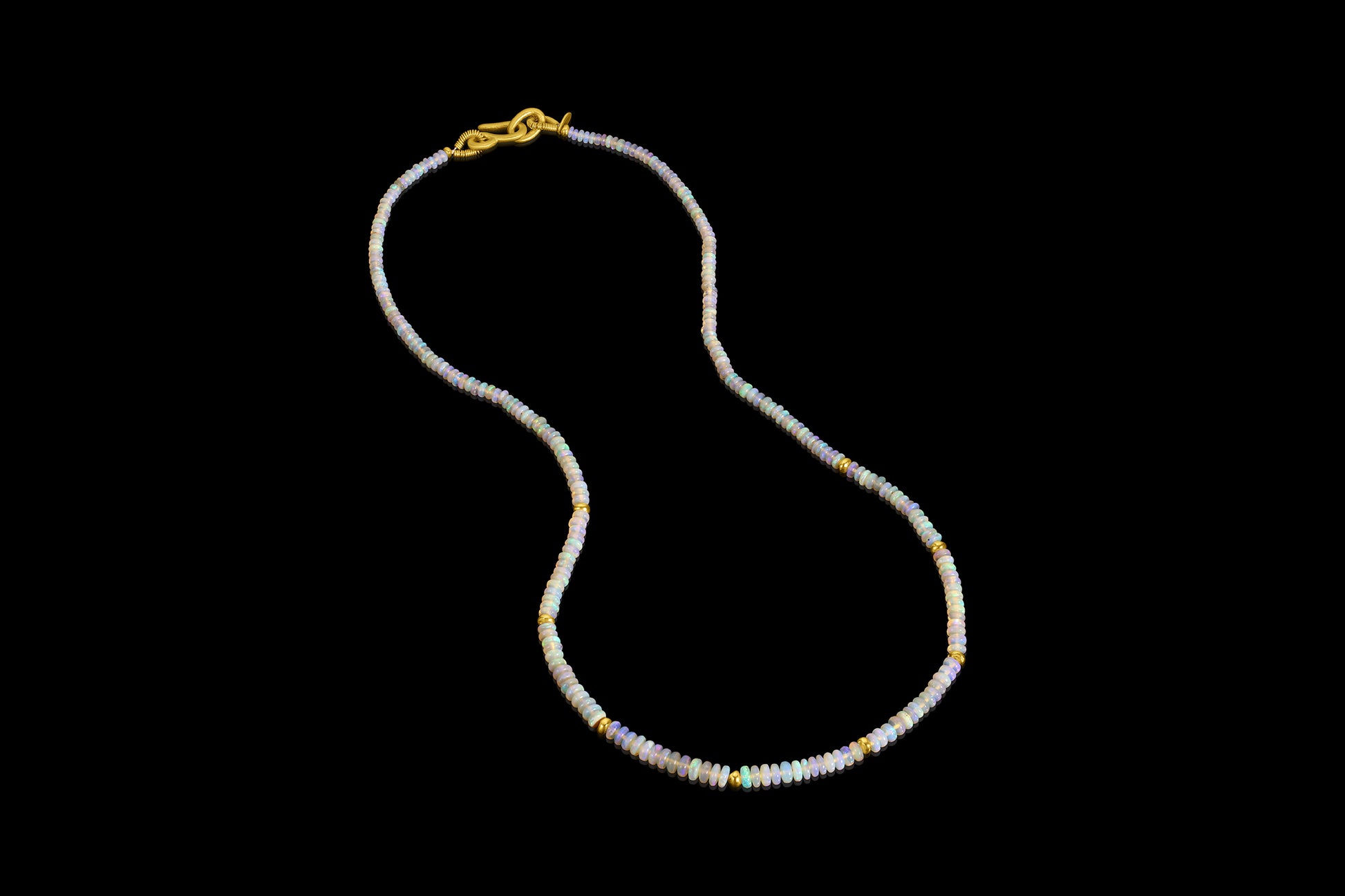 A delightful one-of-a-kind necklace composed of white opals accented with handmade 22-karat-gold beads. The necklace shows flashes of rainbow colors as the wearer moves. Finished with our signature 22-karat gold hook clasp, this necklace is perfect worn alone or layered with pendants and other pieces from our Chain Library.