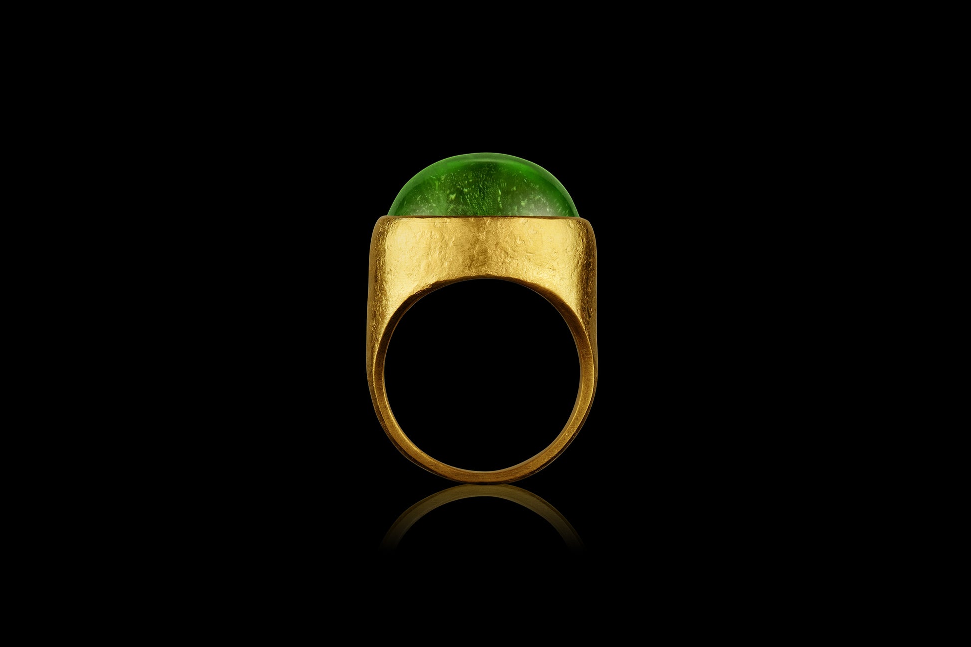 Finished with an antique Roman hammer to create the organic matte texture unique to Loren Nicole, this hand-raised ring is perfectly shaped to fit the cabochon peridot at the center. The stone is a wonderful yellow-green color with a spirited interior that seems to glow from within. This modern, wearable ring is a variation on the ancient form of the signet ring, used to denote power and status for thousands of years. A smooth inner band closes the hollow form of the ring and fits comfortably against the finger.